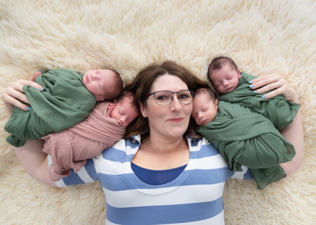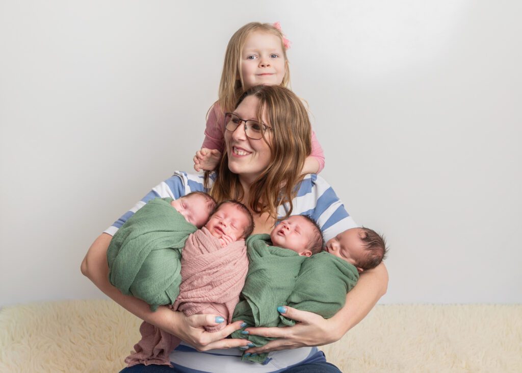 When session day arrived, the Quadruplets were exactly one month old, it was truly all hands on deck. Darlene came with her full crew—her mom and a friend in tow—and I made sure to have my assistant, Lacey, there as well, knowing I’d need every extra set of hands. We started the only way you really can with four newborns: feeding time. Once the first baby was fed and settled, I began photographing them individually, working through each little personality one by one before attempting the group shots… and then adding in big sister Alyvia, and of course, mom.